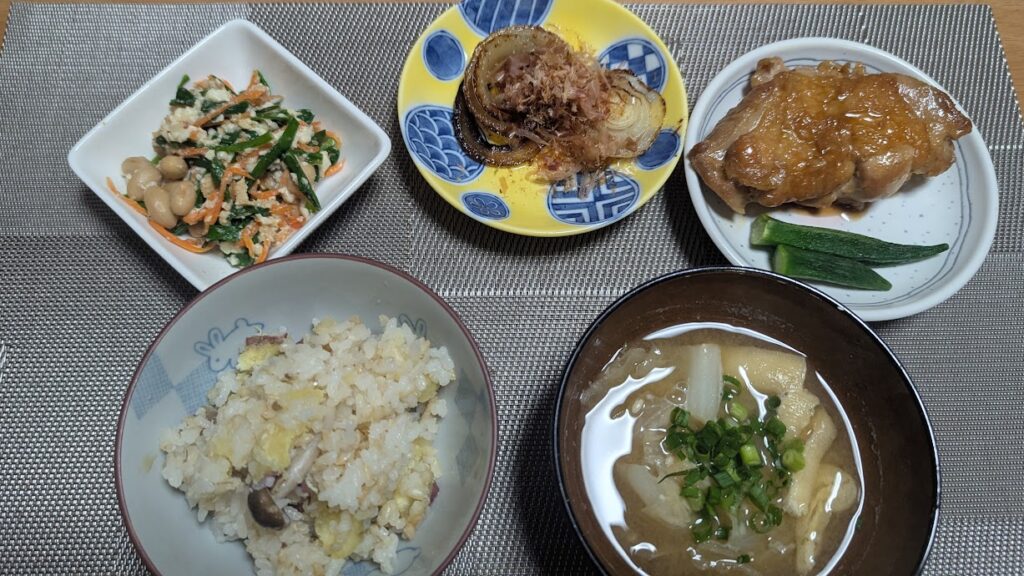厚揚げを使った白あえ・玉ねぎバターソテー・鶏のてりやき・味噌汁・さつまいもごはん